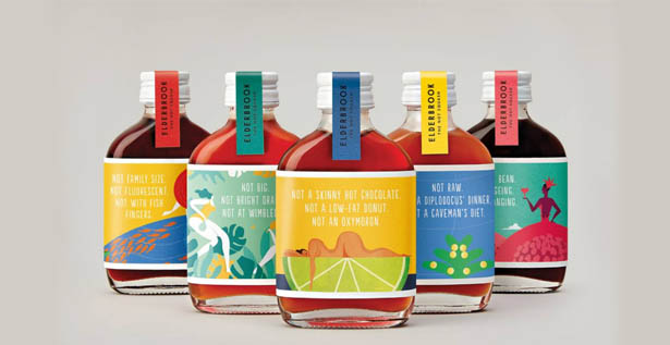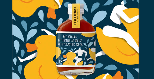 Los jugos naturales Elderbrook están envasados en «petacas» y sus etiquetas tienen impreso dibujos de diferentes artistas plásticos.