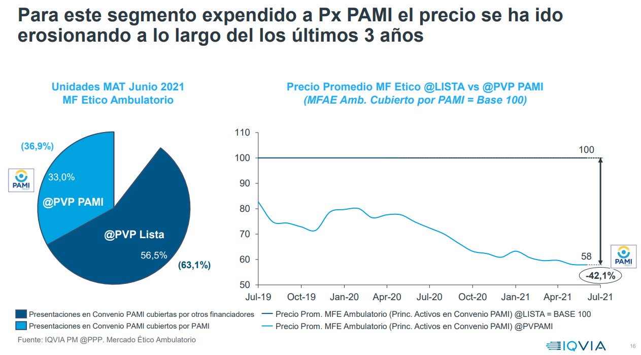 Desde la renovación del convenio PAMI en abril del 2018, durante el gobierno de Mauricio Macri, tomó forma el controversial PVP: Precio de Venta PAMI. Inicialmente dicho precio era un 5% menor al valor de lista consignado en Kairos. Sin embargo, en un webinar llevado a cabo por IQVIA, dicho monto se ha erosionado en los últimos tres años hasta el 42,1% actual en el segmento ético ambulatorio.