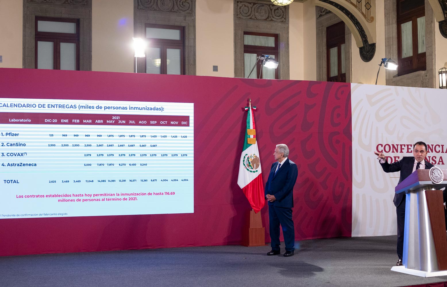 El gobierno de México firmó contratos de pre-compra con los laboratorios AstraZeneca, Pfizer y CanSino Biologics para la adquisición de más de 198 millones de dosis de las vacunas anti-COVID-19 que las tres compañías tienen en desarrollo. El anuncio fue realizado por el presidente de México, Manuel López Obrador, quien encabezó una conferencia de prensa en la que detalló los puntos claves de los acuerdos.