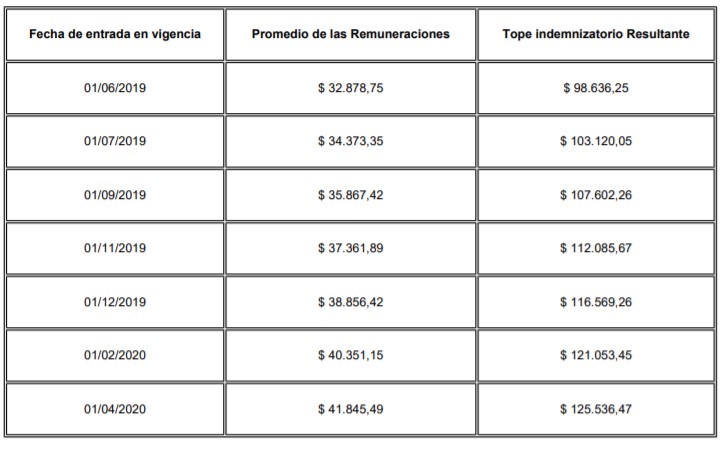 Según lo establece el artículo 245 de la Ley de Contrato de Trabajo, la cartera laboral debe publicar los promedios de remuneraciones sobre los cuales se fijan los topes indemnizatorios cada vez que se firma un acuerdo salarial.