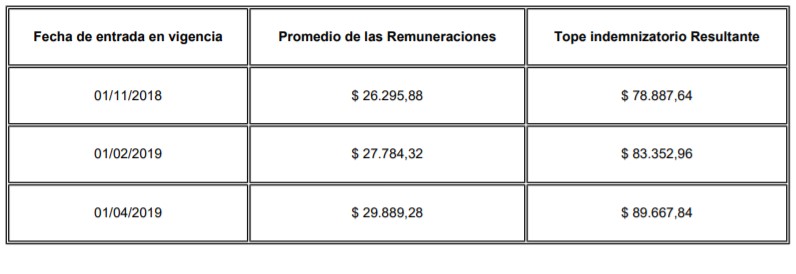 Así, se fijaron topes de $78.887,64 (u$s 750,02) a partir del 1° de noviembre del 2018; de $83.352,96 (u$s 792,54) desde el 1° de febrero del 2019; y de $89.667,84 (u$s 852,65) con vigencia desde el 1° de abril del 2019. Ver Anexo I