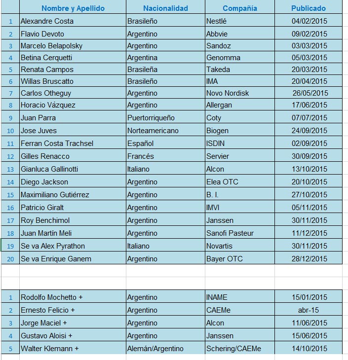 En el segundo semestre del año hubo cambios en Biogen. Allí el norteamericano José Juves asumió como nuevo CEO en Argentina reemplazando a Víctor Verdejo. Ver artículo. En este mismo período, Servier nombró al francés Gilles Renacco como CEO en la filial local, para reemplazar a Emmanuel Pradere. Ver artículo