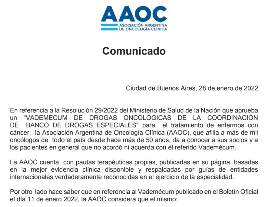 La entidad, que afilia a más de mil oncólogos a nivel país, publicó una solicitada el lunes 7 de febrero en los diarios de mayor tirada del país: Clarín y La Nación. En la misma dijo que «no acordó ni acuerda con el referido vademecum«. Ver Comunicado.