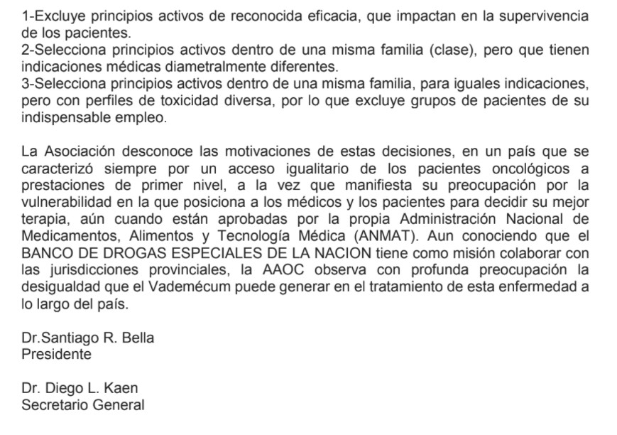 La AAOC fundamenta su rechazo en tres razones taxativas. Por un lado, afirma que se excluyen principios activos de reconocida eficacia, que impactan en la supervivencia de los pacientes. Además subraya que se seleccionan principios activos dentro de una misma familia (clase), pero que tienen indicaciones médicas diametralmente diferentes. Y, por último explica que se seleccionan principios activos dentro de una misma familia, para iguales indicaciones, pero con perfiles de toxicidad diversa, por lo que excluye grupos de pacientes de su indispensable empleo.