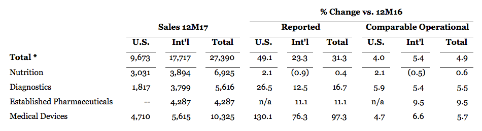 La norteamericana Abbott puso sobre la mesa sus resultados anuales del 2017. La multi dijo que creció un 4.9% en ventas con respecto al año anterior, y que alcanzó una facturación de u$s 27.390 millones. Ver press release.