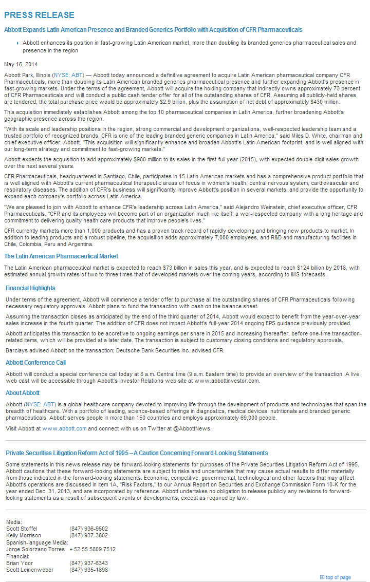 Abbott adquirirá el holding que indirectamente posee aproximadamente el 73% de CFR Pharmaceuticals, y llevará adelante una OPA por el resto de las acciones de CFR. Ver press release.