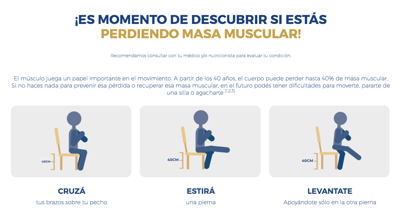 La campaña global se alinea con los «challenges» que se pueden encontrar en Internet, y propone tres pasos para chequear la pérdida de masa muscular. Primero, sentados, cruzar los brazos sobre el pecho, luego estirar una pierna y finalmente levantarse apoyándose solo en la otra pierna. El desafío además menciona las recomendaciones para evitar lesiones.