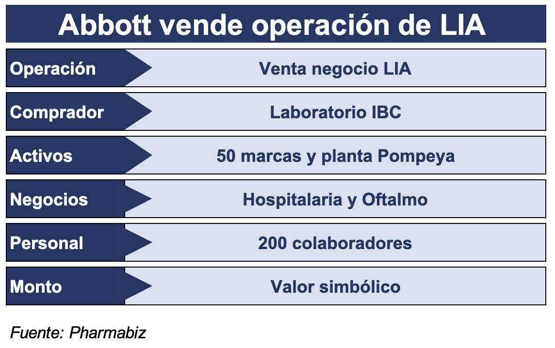 La norteamericana Abbott termina de desprenderse del negocio que heredó tras la compra de Recalcine hace una década. La multi vendió el paquete accionario de LIA, especializado en Hospitalaria y Licitaciones, a los nacionales de IBC y enfocados en el mercado de inyectables.
