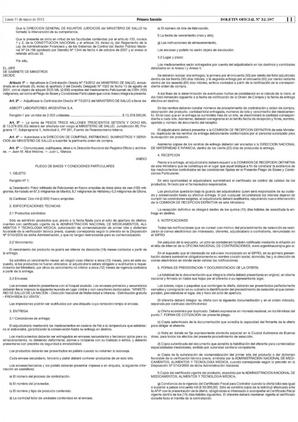 La contratación directa nº 73/2012 fue publicada en el Boletín Oficial del día de hoy, lunes 11 de marzo de 2013 a través de la Decisión Administrativa 27/2013 y fue solicitada por la Dirección Nacional de Maternidad e Infancia del Ministerio de Salud.