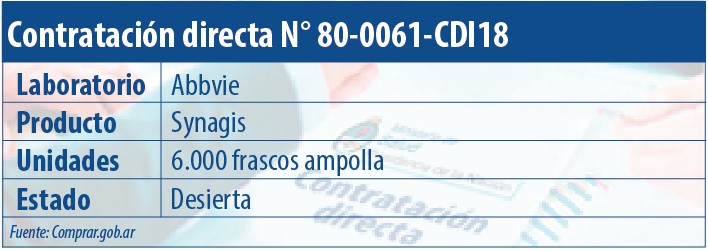 La secretaría de Salud iba a abrir una Contratación Directa en pos de adquirir el anticuerpo monoclonal Synagis de la norteamericana Abbvie. Sin embargo, la compra fue desestimada y quedó «desierta«.
