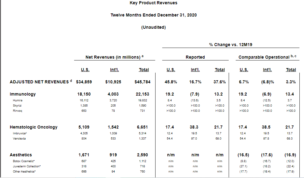 Las ventas globales de la norteamericana Abbvie exhibieron un fuerte crecimiento del 37.6% durante 2020 al totalizar u$s 45.784 millones. El salto estuvo impulsado principalmente por la consolidación contable de Allergan, la compañía dueña del popular Botox que fuera adquirida en mayo de 2020.