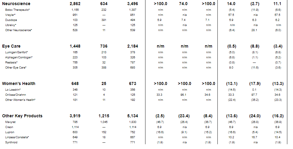 Los segmentos de Neurociencia y Women’s Health crecieron en ambos casos más del 100% a u$s 3.496 millones y u$s 673 millones respectivamente. Por su lado, la división de Estética le aportó ingresos por u$s 2.590 millones, y la de Cuidado Ocular contribuyó con u$s 2.184 millones. En estos casos, Abbvie no reflejó comparaciones interanuales porque estas carteras fueron heredadas desde Allergan.