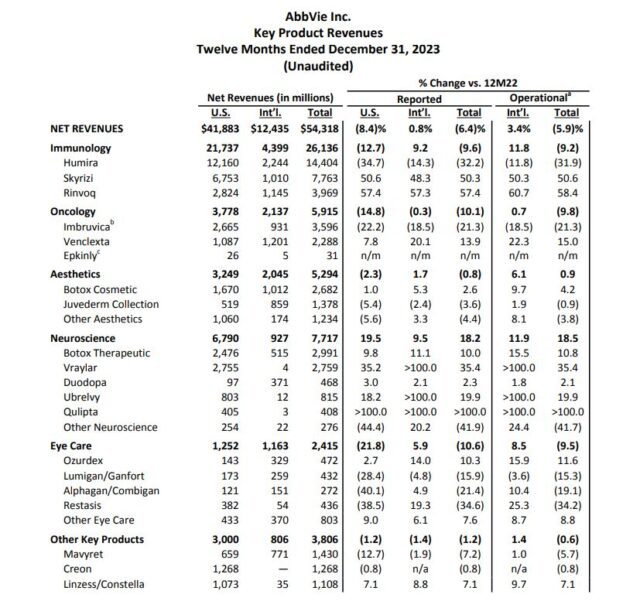 La estadounidense Abbvie publicó hoy, viernes 2 de febrero, su reporte financiero anual correspondiente al 2023. Allí detalló que obtuvo ingresos por u$s 54.318 millones, lo que significó un descenso del 6,4% en comparación con el año anterior. Ver Press Release.