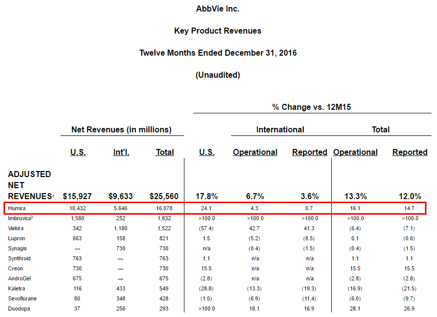 Sin embargo, lo más destacable es que Humira le significó casi el 63% de sus ingresos totales. Durante el 2016 Humira facturó u$s 16.078 millones, y reportó un alza interanual del 16.1%.
