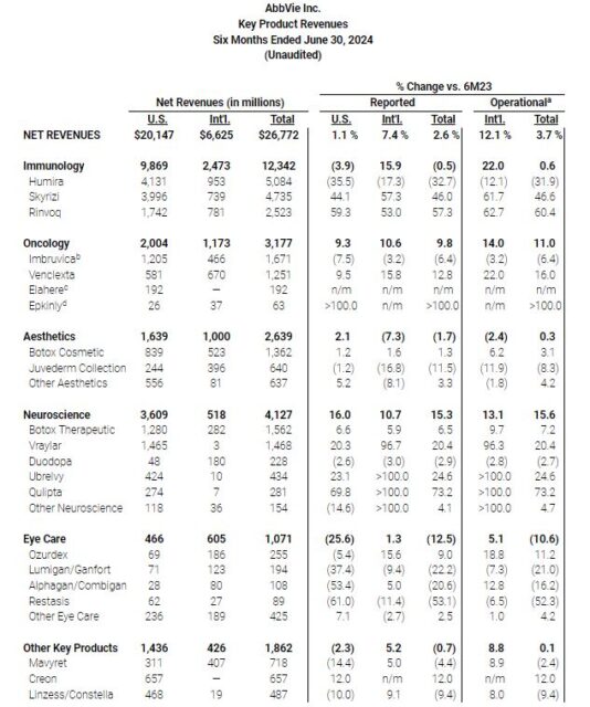 Los ingresos globales de la estadounidense Abbvie crecieron un 2,6% durante el primer semestre de 2024 al totalizar u$s 26.772 millones. El gigante farmacéutico sintió la fuerte caída en facturación de su histórico blockbuster Humira, la que fue parcialmente compensada por el crecimiento de los ascendentes Skyrizi, para artritis psoriásica y de Rinvoq, para artritis reumatoide.