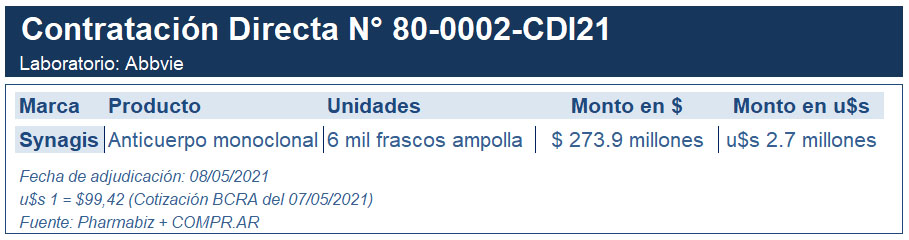 Este fin de semana se definió una contratación directa por exclusividad. Mediante la misma, el laboratorio norteamericano Abbvie le venderá al Estado su anticuerpo monoclonal Synagis. El proceso le generará ingresos por $273.9 millones (u$s 2.7 millones). Se trata de una de las tres contrataciones directas por exclusividad a favor de la multi que tuvieron inicio durante el mes de febrero.