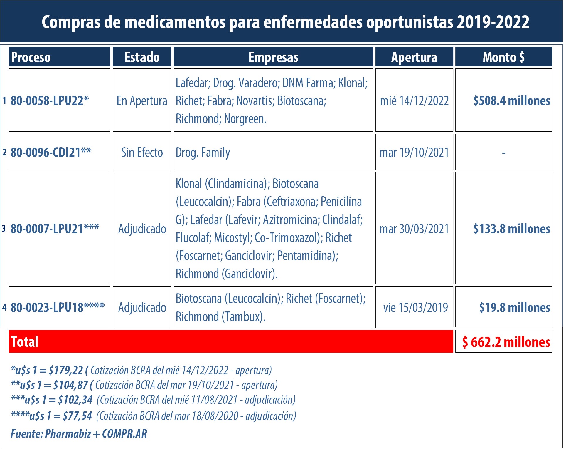 Una decena de empresas están en carrera a fin de proveer al Estado de diferentes partidas de medicamentos indicados para enfermedades oportunistas. Este proceso podría significarle a la cartera sanitaria una erogación cercana a $508.4 millones (u$s 2.8 millones).