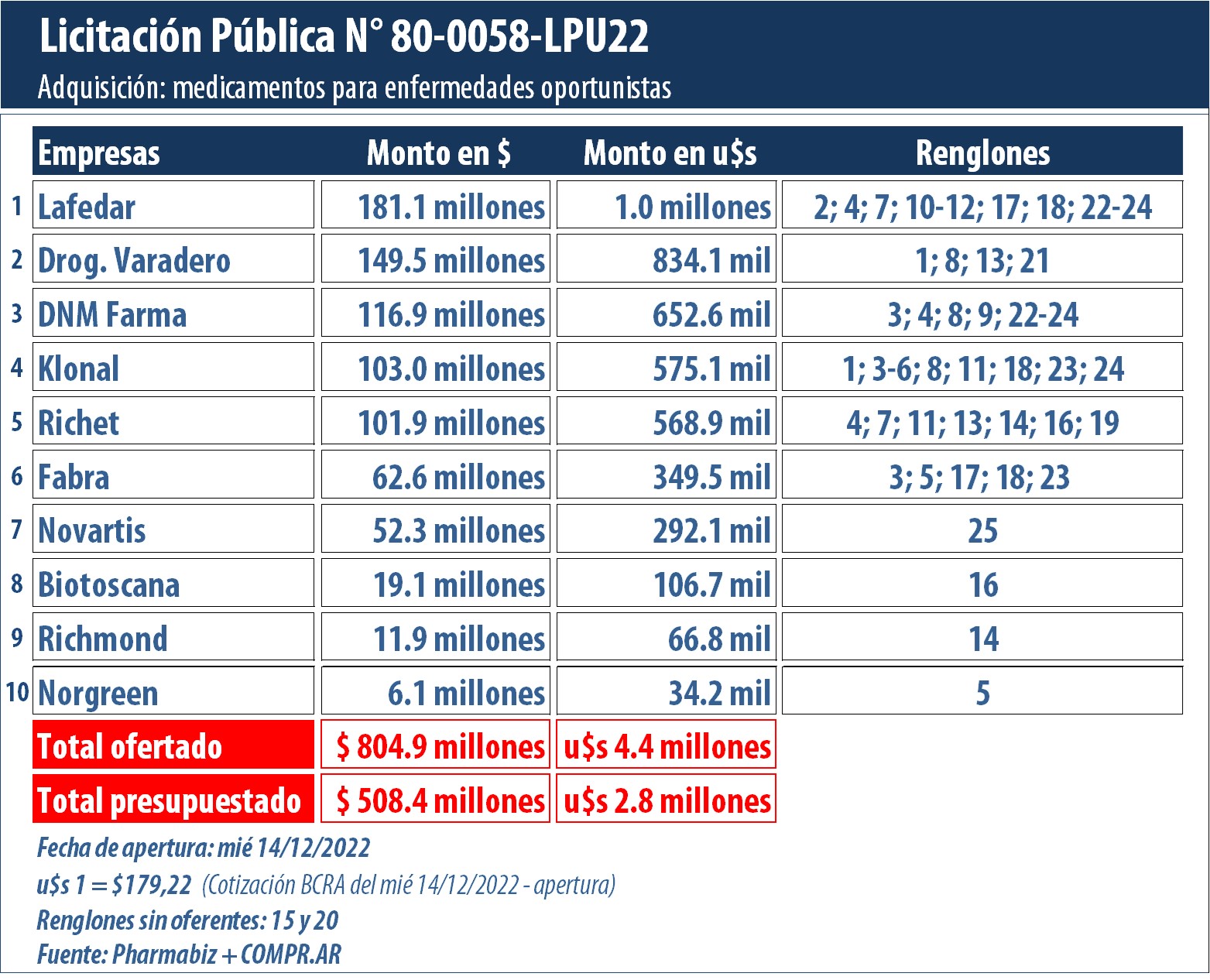 Según el desglose realizado por el equipo de analistas de Pharmabiz, una decena empresas fue registrada en la compulsa. El principal oferente fue el nacional Lafedar, que se postuló en 11 renglones, por un total de $181.1 millones (u$s 1.0 millones). En segundo lugar, en términos de facturación, le siguió la droguería Varadero, la que cotizó $149.5 millones (u$s 834.1 mil) a fin de proveer partidas de antivirales y antibióticos de los nacionales de IBC, de Gemepe, de Richet, y de Vannier, correspondientes a cuatro renglones. Ver Cuadro Comparativo.