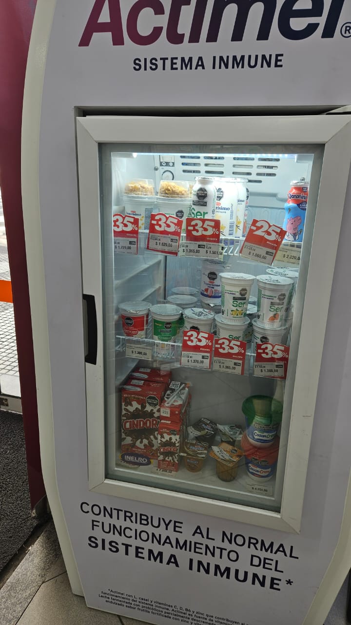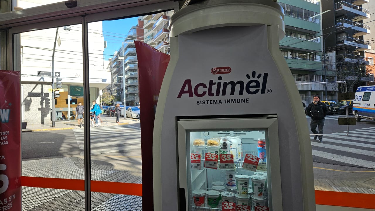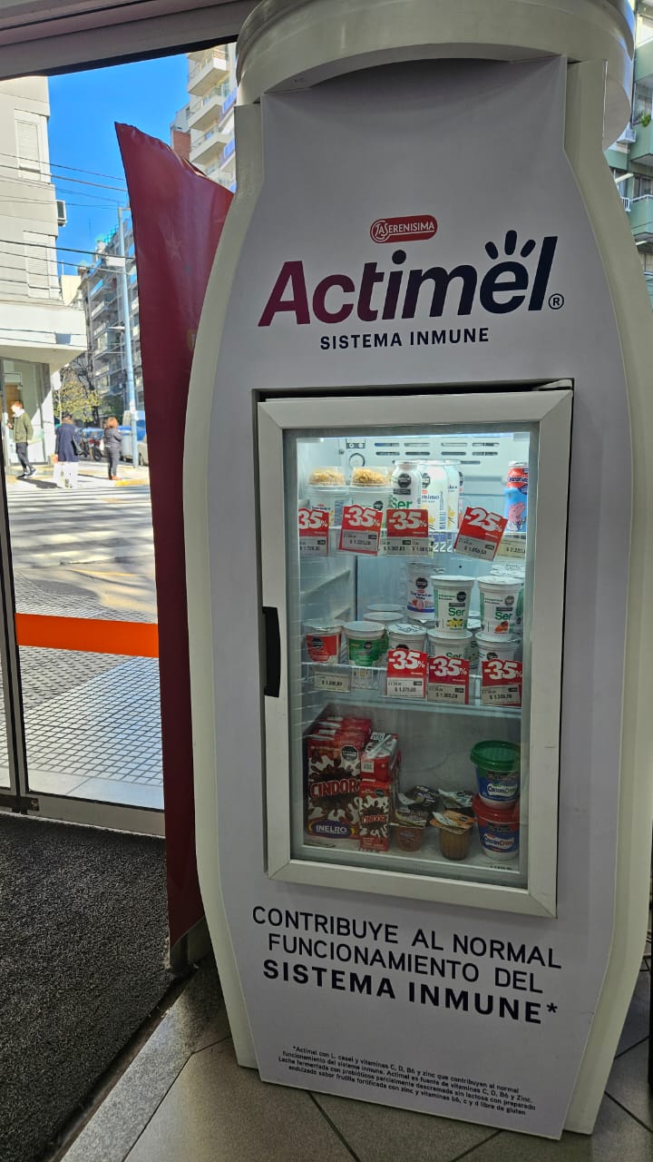 En una heladera vertical y ploteada con la marca Actimel se comercializan además yogures líquidos, sólidos; quesos crema y hasta chocolatada. En tanto, el portfolio de Actimel está compuesto por las variedades Plus; Multifruta; Multifruta sin azúcares agregados; Frutilla y Kids. Ver sitio Actimel