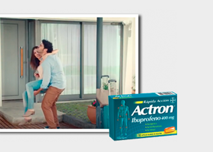 En ese escenario, el esposo intenta levantar a su cónyuge y con ese movimiento característico de las publicidades de la marca, el hombre se ve afectado por un dolor de espalda que atenta con arruinar su momento perfecto. Sin embargo, el mismo opta por Actron para remediar tal situación. Así logra no solo el cometido sino que incluso más tarde, su chica se le sube «a caballito».