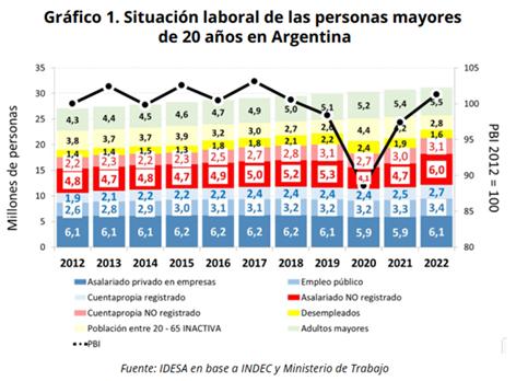De acuerdo con un gráfico elaborado por el Instituto Idesa, que mide la evolución de 2012 a 2022 de la situación laboral de las personas mayores de 20 años en Argentina, “de 12 millones de trabajadores registrados, sólo la mitad es asalariada en el sector privado, que es la que más aporta al financiamiento de la seguridad social”.