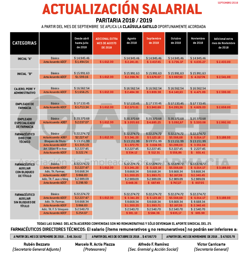 Y ahora el sindicato que nuclea a los empleados de farmacias, ADEF, que había cerrado en abril su paritaria por un incremento salarial del 19% actualizó sus porcentajes. Las partes activaron la cláusula gatillo para conformar una suba escalonada en tres tramos: 23% en septiembre; 25% en octubre; y 27% en noviembre. Ver artículo