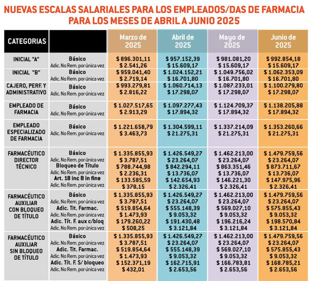 Esto incluye: el básico de $1.426.549,27 (u$s 1.195,75), el bloqueo de título por $842.294,11 (u$s 706,02), una suma que emerge del Art. 18 inc B in fine de $142.654,96 (u$s 119.57) y conceptos no remunerativos por $39.326,55 (u$s 32,96). Mientras tanto, un empleado especializado de farmacia percibirá en abril un básico de $1.304.599,11 (u$s 1.093.53), y un monto no remunerativo de $21.275,31 (u$s 17,83), por un total de $1.325.874,42 (u$s 1.111,36).