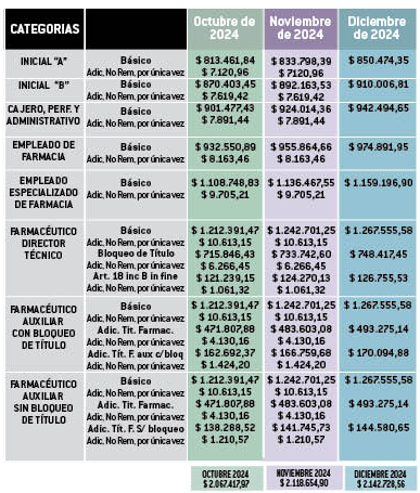 Tras esta actualización un director técnico percibirá en diciembre un sueldo de $2.126.629,63 (u$s 2.050,83), lo que incluye: el básico de $1.267.555,58 (u$s 1.222,38), el bloqueo de título por $733.742,60 (u$s 707,6), una suma que emerge del Art. 18 inc B in fine de $124.270,13 (u$s 119,8) y conceptos no remunerativos por $1.061,32 (u$s 1,02). Mientras tanto, un empleado especializado de farmacia percibirá en diciembre $1.159.196,90 (u$s 1.117,9).