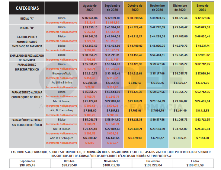 En julio, el gremio y la Cámara Argentina de Farmacias –CAF-, la Cámara de Farmacias del Oeste –CAFABO–, la Cámara de Farmacias de la Zona Sur –CAFASUR-, la Asociación de Propietarios de Farmacias –ASOFAR– y la Federación de Cámaras de Farmacias –FACAF-, acordaron un aumento del 6.8% sobre el básico de febrero de 2020. En agosto sumaron un incremento del 1.9%, esta vez tomando como referencia el salario de julio. Tras esta nueva actualización, se totalizará una suba anual del 22.2%. Ver artículo Ver artículo Ver artículo