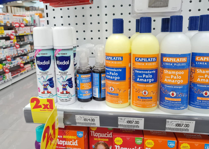 El segmento de los piojicidas registra una facturación anual de $817.4 millones (u$s 5.6 millones), con Zona Libre y Nopucid a la cabeza. Aunque, en la categoría hay otras marcas que intentan posicionarse. Por caso, figura en góndola el aerosol Rixdal, del tercerista Aerofarma.