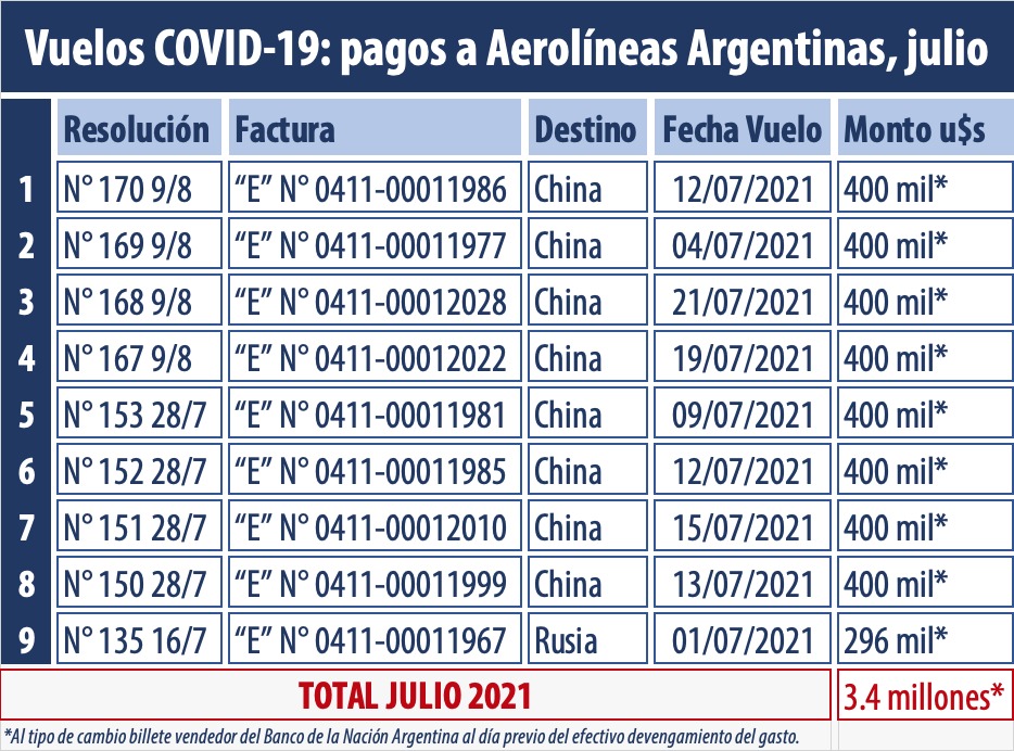 El pasado 27 de julio, la cartera sanitaria encabezada por Carla Vizzotti oficializó la contratación de cerca de 100 vuelos con Aerolíneas Argentinas. Allí se prevé una erogación por parte del Estado de u$s 36 millones, para el traslado de cargas desde 14 destinos internacionales. Figuran: China; Rusia; Países Bajos; Estados Unidos; Corea del Sur; India; Brasil y México. Ver artículo Aerolíneas: Contratación por u$s 36 millones