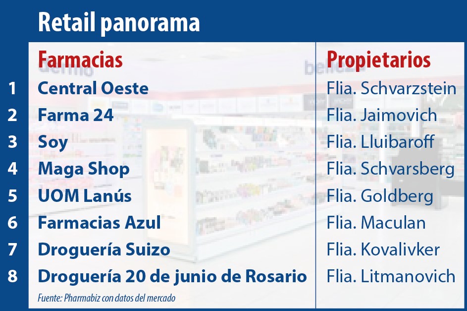 Asimismo, en el eslabon de las droguerías se destaca la Droguería Suizo, de la familia Kovalivker; y la Droguería 20 de Junio de Rosario, propiedad de la familia Litmanovich.