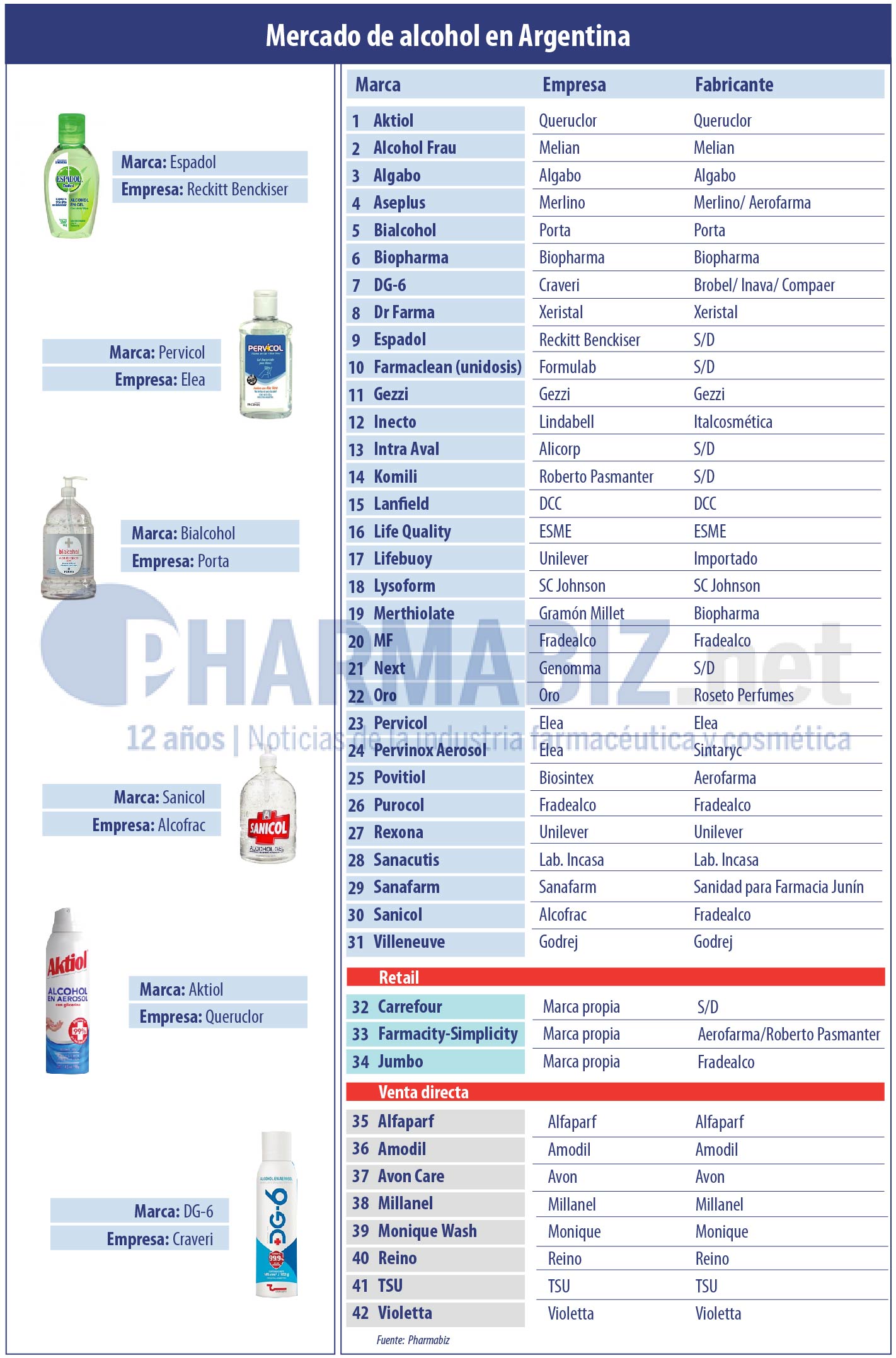 En función de toda la demanda generada, las grandes usinas de fabricantes locales tuvieron su capacidad operativa al máximo. Uno de los ganadores fue Biopharma, una empresa propiedad de Julio Tenembaum quien también es dueño de Biferdil. La compañía de base cosmética tiene su propia marca de alcoholes a la vez que manufactura varias líneas para terceros, tales como Merthiolate, de Gramon Millet, la que está conformada por alcoholes en gel y toallitas antibacteriales. Ver artículo Biferdil Ver artículo Merthiolate