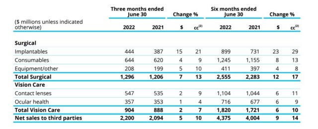 Su otra unidad, Vision Care, aportó a la caja de la corporación u$s 1.820 millones, un 10% por encima de los ingresos registrados en el primer semestre 2021, teniendo en cuenta el impacto de los tipos de cambio. Aquí Lentes de Contacto registró un alza del 11% a u$s 1.104 millones, en tanto que Salud Ocular avanzó un 9% con una facturación de u$s 716 millones.