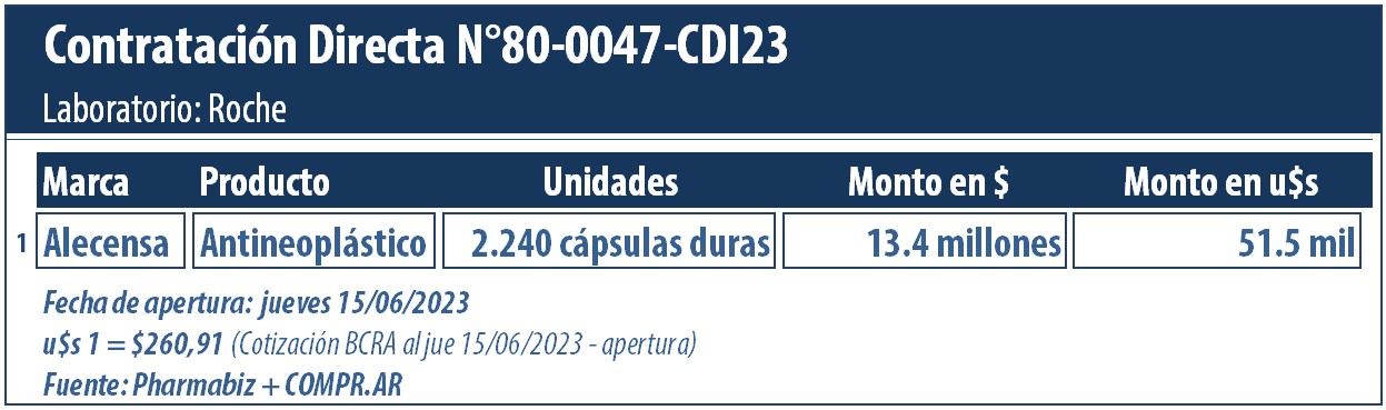 Por primera vez, la suiza Roche se subió a la agenda de compras públicas con Alecensa. Se trata de un antineoplásico base de alectinib 150 mg., indicado para cáncer de pulmón y aprobado por la ANMAT en el 2017.