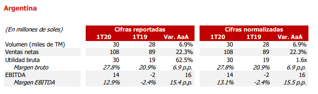La empresa de capitales peruanos, exhibió ventas netas por 2.448 millones de soles peruanos (u$s 705 millones), lo que implicó un alza del 10% en comparación con el primer trimestre del año anterior. Ver presentación.