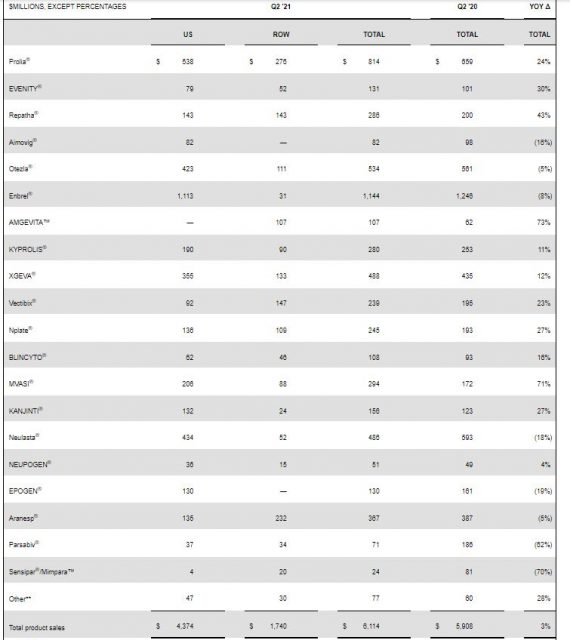 Las ventas de la estadounidense Amgen se mantuvieron estables durante el primer semestre de 2021. Según sus estados contables, la facturación en el período ascendió a u$s 12.427 millones, frente a los u$s 12.367 millones registrados en 2020. Ver Press Release.
