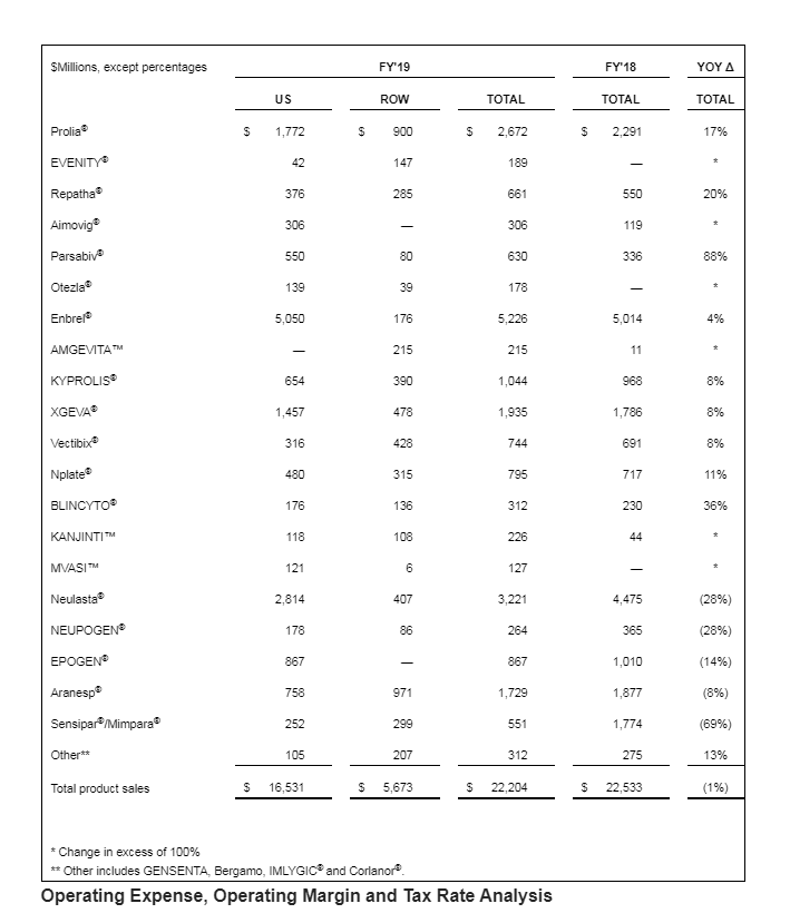 Su producto estrella fue Parsabiv -para hiperparatiroidismo- que vio incrementar sus ventas un 88% durante el 2019 y le siguió su oncológico Blincyto con un ascenso anual del 36%. En tercer lugar, Repatha -para colesterol- creció un 20% en el año cerrado.
