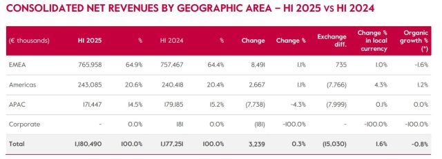 En términos geográficos, la región EMEA aportó €766,0 millones en el primer semestre, lo que representa una suba del 1,0%. Por otro lado, la región APAC aportó €171,4 millones, un leve aumento del 0,1%. La italiana informó también que sus ventas en la región de Las Américas crecieron 4,3% a €243,0 millones.