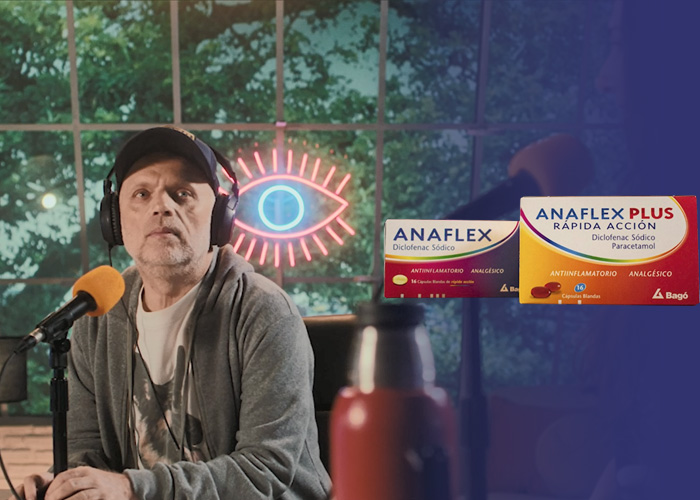Por eso, el laboratorio nacional volvió a convocar a esta dupla. En el spot el conductor relaciona todos los temas con el dolor. «Hoy me desperté así, dolor de cuello, espalda, cintura, ¿tenés un Anaflex?», le comenta el humorista a su compañera, quien en la radio le da una caja de Anaflex Plus Rápida Acción, en cápsulas blandas.