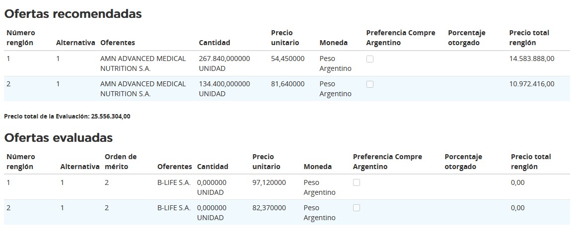 En su momento también, la empresa especializada en nutrición clínica B-Life se anotó con la etiqueta PKU A Fórmula –de 400 gr. por $26 M (u$s 19,6 mil*), y con su marca XPhe Infant –de 500 gr– por un total de $11,1 M (u$s 8.125*) para cubrir la demanda del segundo renglón. Sin embargo, su propuesta no fue recomendada ya que superó en precio a las de la anterior.