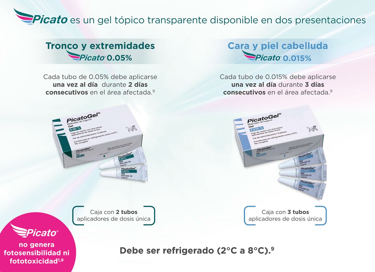 Picato está disponible en dos presentaciones: una para tronco y extremidades; y otra para cara y piel cabelluda. El mismo debe ser refrigerado de 2° a 8°.