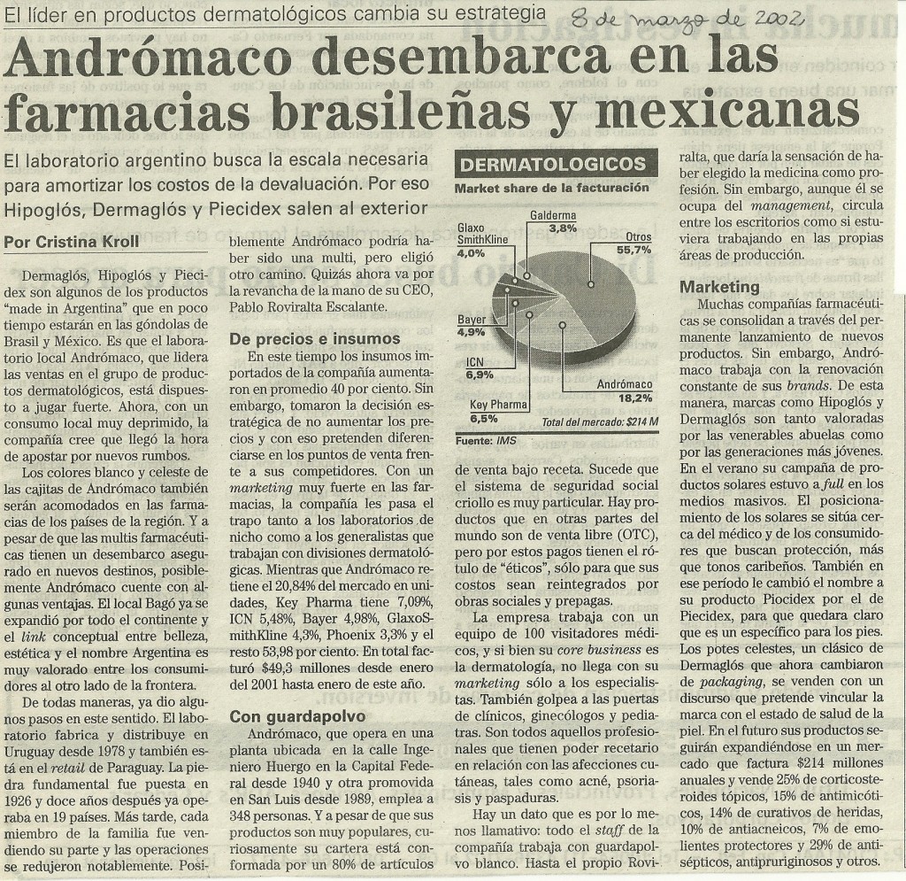 Muchas compañías farmacéuticas se consolidan a través del permanente lanzamiento de nuevos productos. Sin embargo, Andrómaco trabaja con la renovación constante de sus brands. De esta manera, marcas como Hipoglós y Dermaglós son tanto valoradas por las venerables abuelas como por las generaciones más jóvenes. En el verano su campaña de productos solares estuvo a full en los medios masivos. El posicionamiento de los solares se sitúa cerca del médico y de los consumidores que buscan protección, más en tonos caribeños. También en ese período le cambió el nombre a su producto Piocidex por el de Piecidex, para que quedara claro que es un específico para los pies. Los potes celestes, un clásico de Dermaglós que ahora cambiaron de packaging, se venden con un discurso que pretende vincular la marca con el estado de salud de la piel. En el futuro sus productos seguirán expandiéndose en un mercado que factura $214 millones anuales y vende 25% de corticosteroides tópicos, 15% de antimicóticos, 14% de curativos de heridas, 10% de antiacneicos, 7% de emolientes protectores y 29% de antisépticos, antipruriginosos y otros.