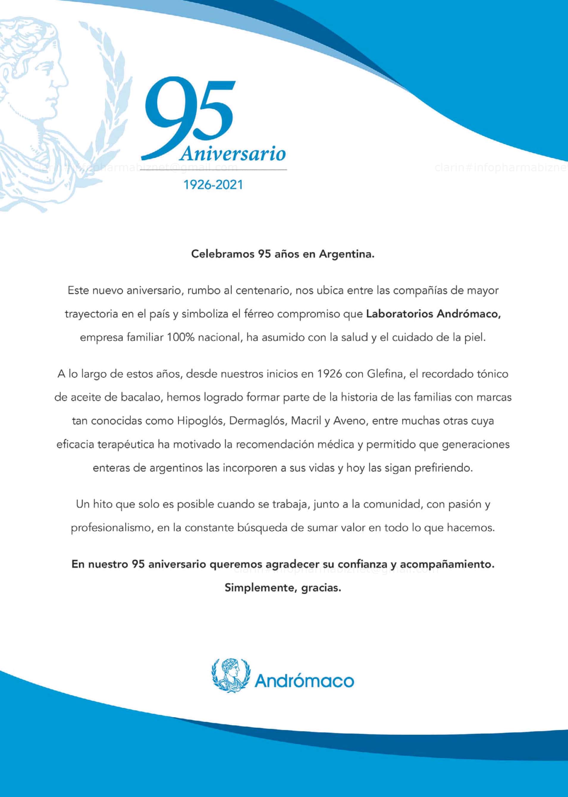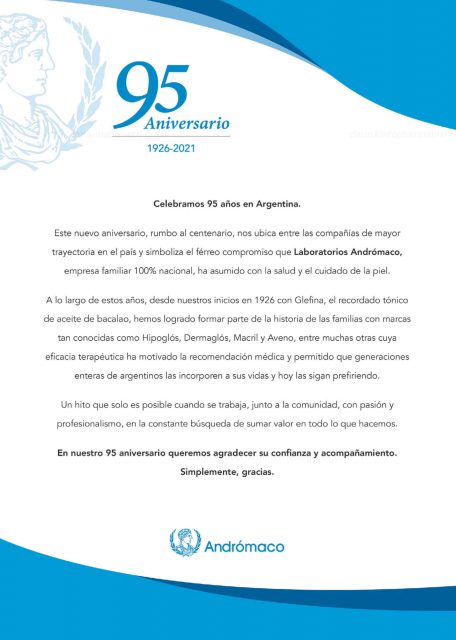 En el mismo expresó que esta nueva etapa rumbo al centenario «nos ubica entre la compañías de mayor trayectoria en el país y simboliza el férreo compromiso que Laboratorios Andrómaco, empresa familiar 100% nacional, ha asumido con la salud y el cuidado de la piel».