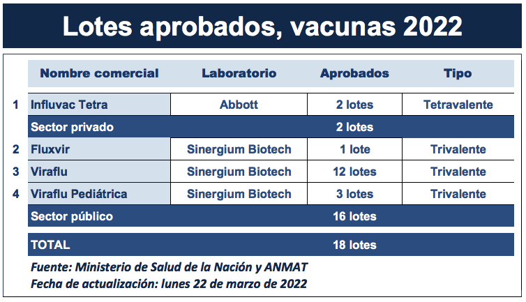 En estos días se sumaron cuatro nuevas partidas de Sinergium Biotech. Fueron 2 lotes de Viraflu para adultos, 1 lote pediátrico, y el primero de la trivalente Fluxvir.