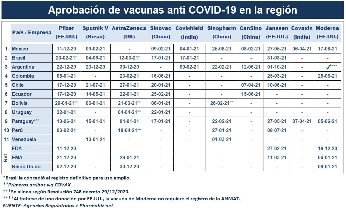 La norteamericana Janssen recibió el OK para su vacuna anti COVID-19 en la Argentina. Fue ocho meses después de que lo hiciera la FDA, quien había dado el puntapié inicial a nivel global entre los organismos regulatorios. Argentina, a su vez, efectiviza su aprobación siete meses después de Colombia y de Brasil, los primeros países de la región que avalaron esta vacuna unidosis. Ver artículo FDA // Ver artículo Colombia // Ver artículo Brasil