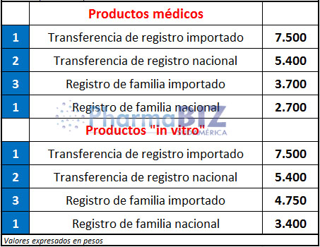 encia de un registro de un producto médico importado tienen un precio fijado en $7.500 (u$s 475). Mientras que para la transferencia de un registro nacional el desembolso será de $5.400 (u$s 342). Si la empresa apunta en cambio a registrar una familia de importados, esto tendrá un costo de $3.700 (u$s 234), por encima del nacional que tiene un fee de $2.700 (u$s 171). Ver lista de precios