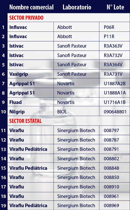 De modo que ya son cuatro los laboratorios privados que tienen aprobados sus lotes para comercializarlos en el canal minorista. Sanofi Pasteur está a la cabeza con cuatro partidas de vacunas. Tres de Istivac; y uno de Vaxigrip. Le sigue Novartis, al que le validaron dos lotes de Agrippal S1, y una de Fluad. Por último, Abbott continúa con dos partidas de su vacuna Influvac. Ver artículo