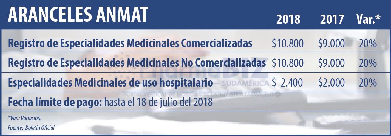 Desde mañana, las empresas tendrán que abonar $10.800 (u$s 425) por cada certificado comercializado y no comercializado durante el año pasado. En tanto, el arancel vigente para las especialidades autorizadas para uso hospitalario implicará el desembolso de $2.400 (u$s 94) por cada certificado. La ANMAT informó también que los titulares de los certificados deberán presentar previamente una declaración jurada anual entre el próximo 18 de junio y el 18 de julio de este año, a través de la página web de la agencia. Ver sitio La normativa que entra en vigencia a partir de mañana especifica que los montos tendrán que abonarse antes del próximo 18 de julio y que se podrá acceder a un plan de pago en seis cuotas mensuales y sin interés. Para tomar tal decisión, la ANMAT dijo que el organismo tiene la «atribución de determinar y percibir los aranceles y tasas retributivas correspondientes a los trámites y registros que se efectúen, como así también por los servicios que se presten». A principios de este año, el organismo comandado por Carlos Chiale había actualizado el tarifario para los diferentes trámites tales como la autorización de un primer lote; las inspecciones de plantas en el extranjero; entre otros. En promedio sus fees también aumentaron un 20% para este 2018. Ver artículo. u$s 1 = $25.5 2017: Ver artículo. Ver artículo. 2016: Ver artículo. 2015: Ver artículo. 2014: Ver artículo. 2013: Ver artículo.