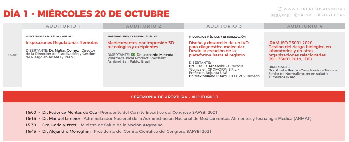 Manuel Limeres participó de la ceremonia de apertura del VI Congreso Internacional y el XVII Congreso Argentino de Farmacia y Bioquímica Industrial, acompañado por Federico Montes de Oca, presidente del Comité Ejecutivo del congreso; Alejandro Meneghini, presidente del Comité Científico del Congreso SAFYBI 2021; Sonia Tarragona, jefa de Gabinete del Ministerio de Salud de la Nación; y Fernando Peirano, presidente de la Agencia I+D+I.